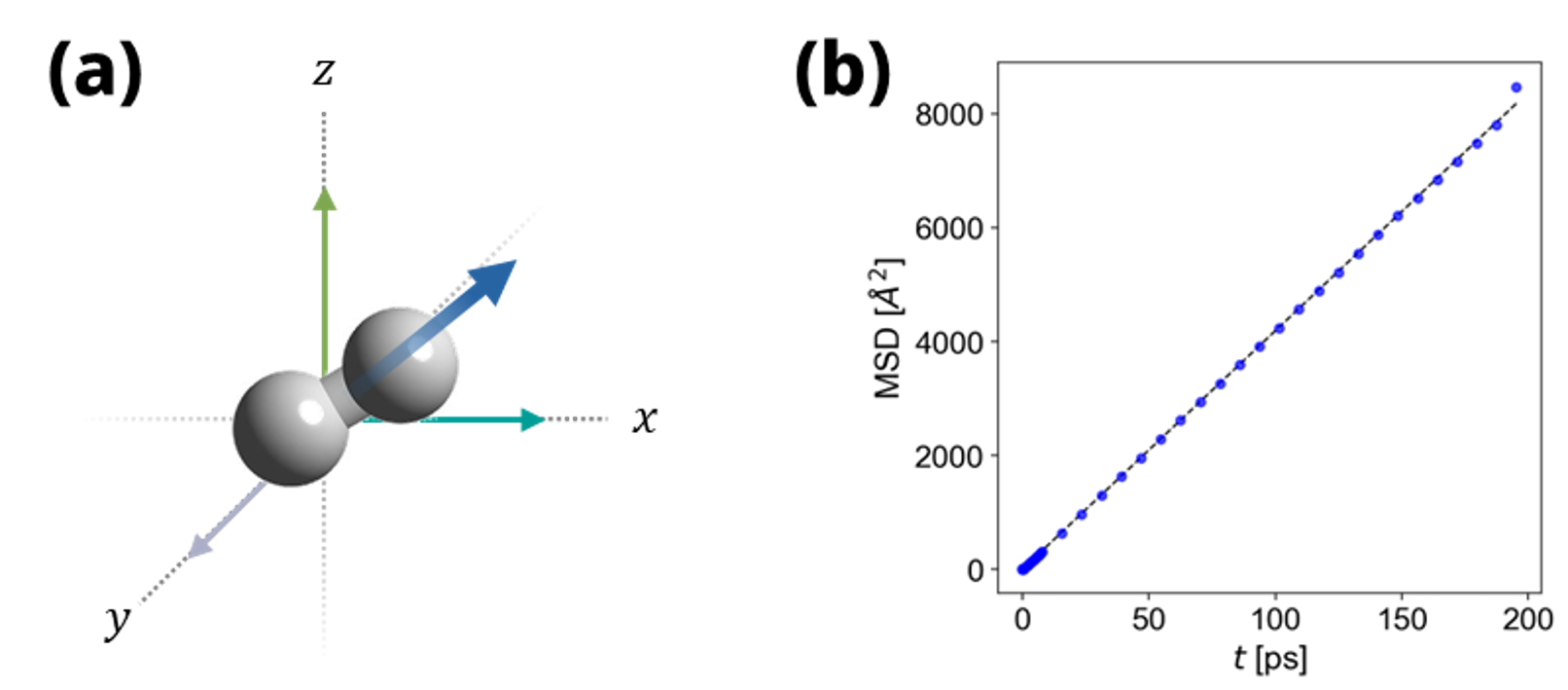 Molecular dynamics is a computational method calculating the movements of atoms and molecules, then the evolving positions of individual molecules over time, allowing the derivation of gas molecule diffusion patterns. During this process, the molecule’s position is represented as a vector in three-dimensional space (x, y, z axes). The MD simulation captures all molecules’ positions through mean-squared displacement (MSDs), calculated using the Einstein formula. MSDs, rooted in Brownian motion studies, signify the average movement speed of particles. Over time, Fig. 1 demonstrates the gradual dispersion of molecules, showing an increase in average distance. Self-diffusivities (\(\mathcal{D}\)) with the desired dimensionality can be computed by fitting MSDs over time to a linear model.