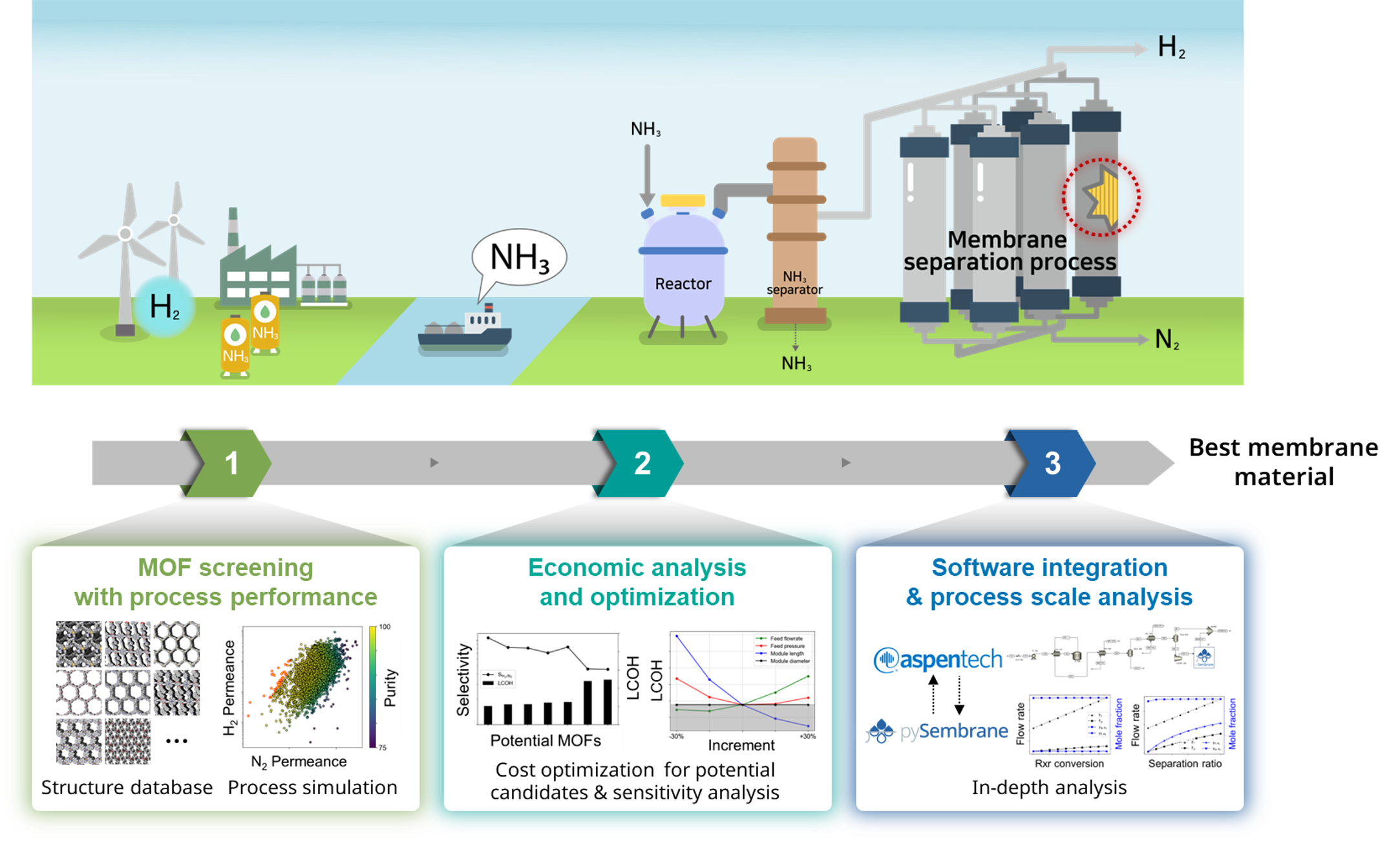In the first example, potential MOFs were selected based on the process performance of the numerous MOFs. Molecular and molecular dynamic simulations were performed to derive the membrane properties of each MOF, and then MOFs with purity exceeding 99.9% were selected through the membrane process simulation. In the second example, the potential MOF selected in the previous step was analyzed in greater depth via process optimization. Given that both product purity and economic viability vary with process variables, the optimal MOF was identified by determining the best process conditions through economic analysis and optimization. In the last example, the performance of the best MOF selected in the previous step was analyzed at the plant scale. The plant-scale model, developed using Aspen Plus commercial software, was integrated with the membrane process model to evaluate the impact of process conditions on both the membrane process and the final product.