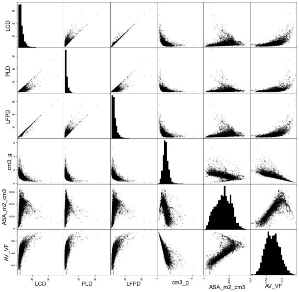 To find the most promising MOF, CoRE MOF 2019 database, which contains 12,020 MOFs, was analyzed for membrane materials. Out of these MOFs, 450 were excluded because of the absence of structure files (.cif) required for subsequent molecular simulations. The database provides structural properties of MOFs such as accessible surface area (ASA_m2_cm3), void fraction (AV_VF), the largest cavity diameter (LCD), pore limiting diameter (PLD), largest sphere along the free path (LFPD), and volume (cm3_g), among others. The distribution and correlations of each property are depicted in Fig. 2.